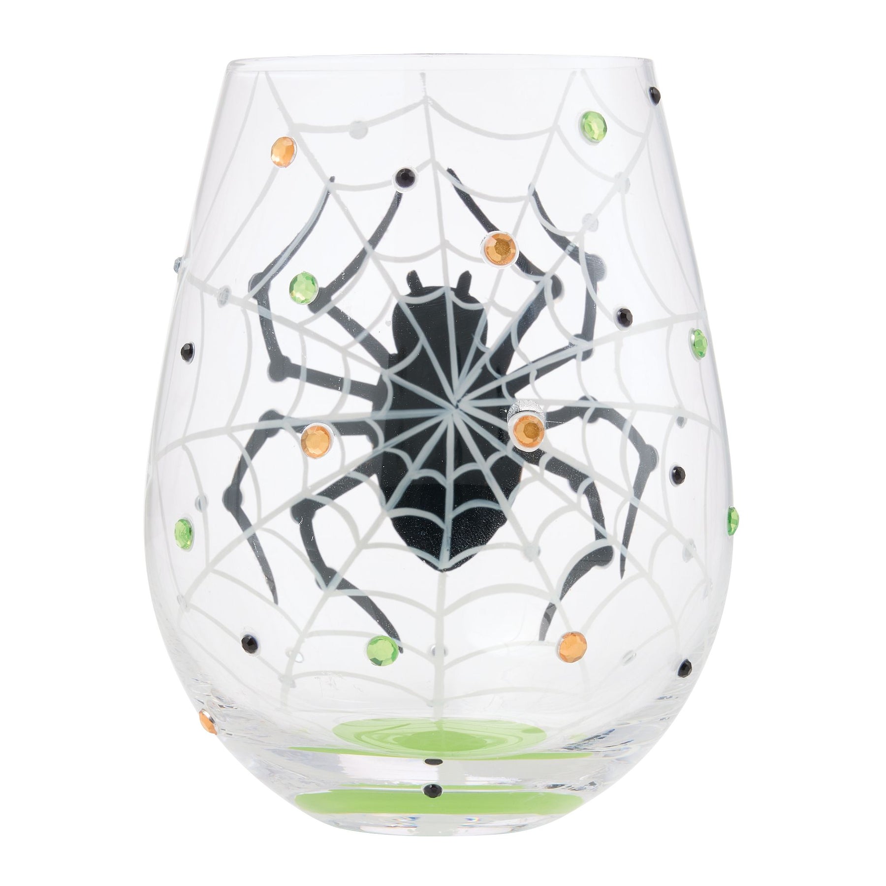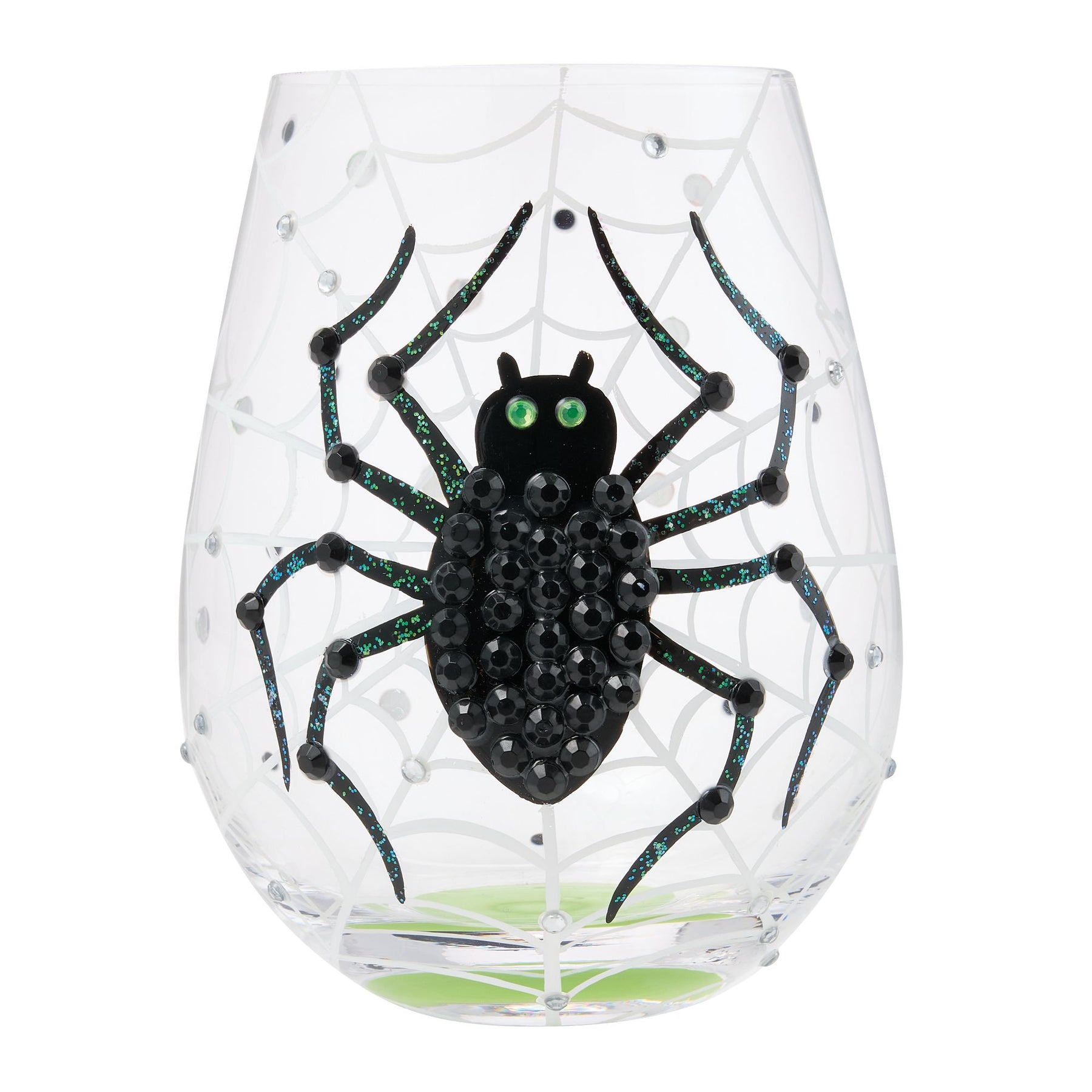Elevate your Halloween offering with this exquisite stemless glass by DesignsbyLolita. Distinguished by a dazzling bejewelled spider that weaves its intrigue amidst a vibrant array of green and orange gemstones, this glass delivers an unforgettable blend of horror and elegance. Its stemless construction with a chic, distinctive green base offers an erganomic yet stylish design, ideal for any customer seeking that perfect blend of fun and functionality for their Halloween festivities. Make this seasonal essential part of your inventory and guarantee a spine-chilling sales boost this season